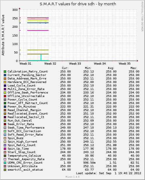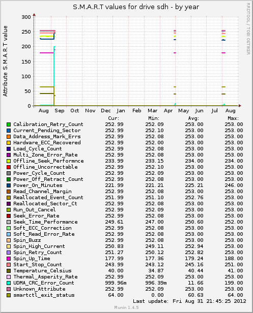 | This graph shows the value of all S.M.A.R.T attributes of drive sdh (Maxtor 6L300R0). smartctl_exit_status is the return value of smartctl. A non-zero return value indicates an error, a potential error, or a fault on the drive. |