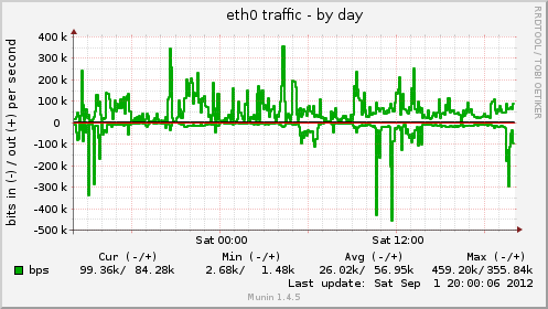 | This graph shows the traffic of the eth0 network interface. Please note that the traffic is shown in bits per second, not bytes. IMPORTANT: On 32 bit systems the data source for this plugin uses 32bit counters, which makes the plugin unreliable and unsuitable for most 100Mb (or faster) interfaces, where traffic is expected to exceed 50Mbps over a 5 minute period. This means that this plugin is unsuitable for most 32 bit production environments. To avoid this problem, use the ip_ plugin instead. There should be no problems on 64 bit systems running 64 bit kernels. |
